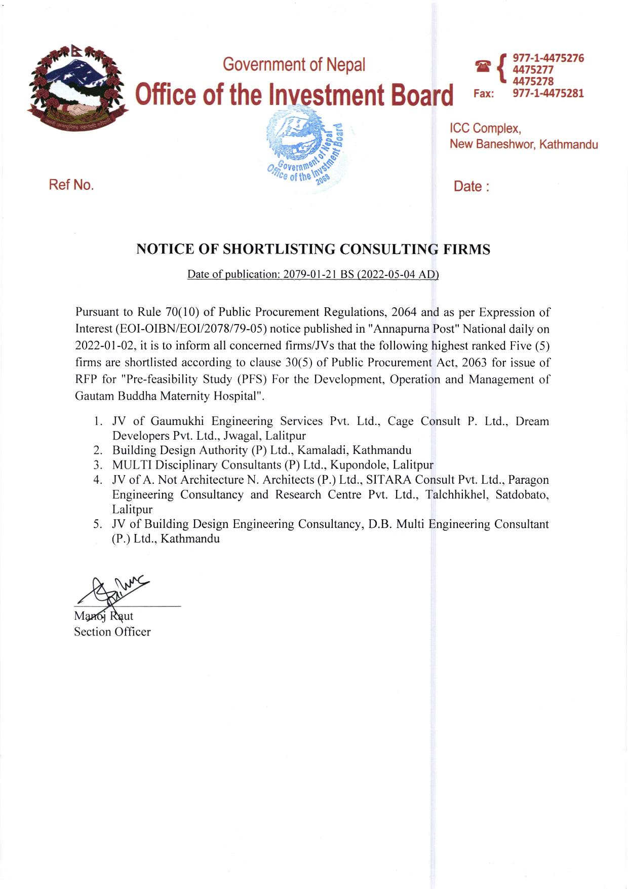 Notice of Shortlisting Consulting firms for issue of RFP for Pre-feasibility Study (PFS) For the Development, Operation and Management of Gautam Buddha Maternity Hospital.